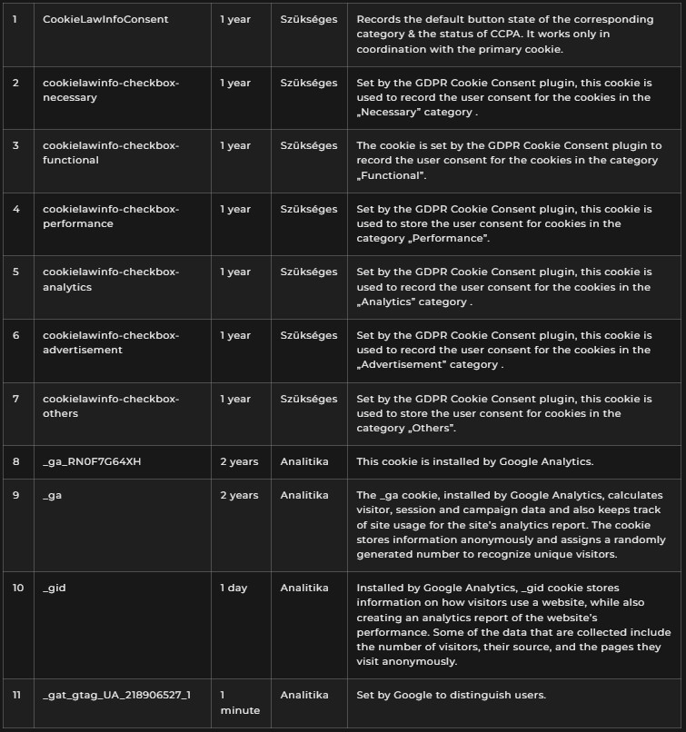 A kapcsolatfelvételi űrlap adatait hat hónapig, az analitikai nyilvántartásokat egy évig őrizzük.